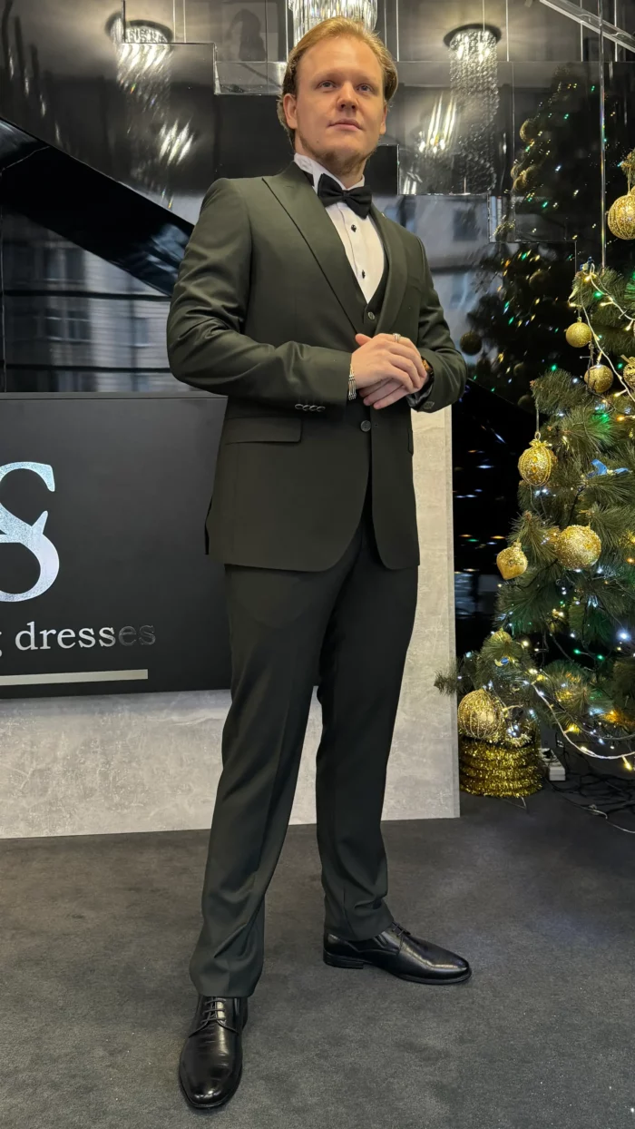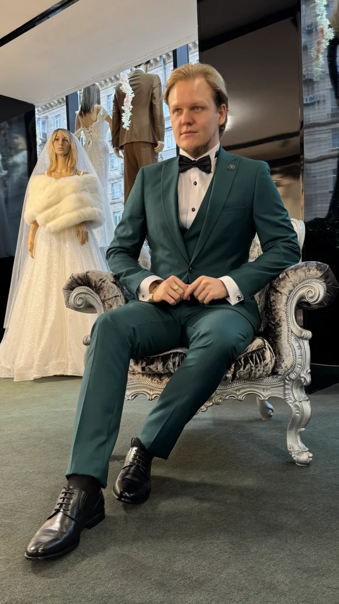 Елегантний чоловічий смокінг глибокого темно-зеленого кольору з класичними лацканами та жилетом. Ідеальний вибір для весілля, випускного чи урочистої події. Вишукана посадка підкреслює фігуру, а поєднання з білою сорочкою та метеликом створює бездоганний вечірній образ. Доступний у прокаті та для купівлі…