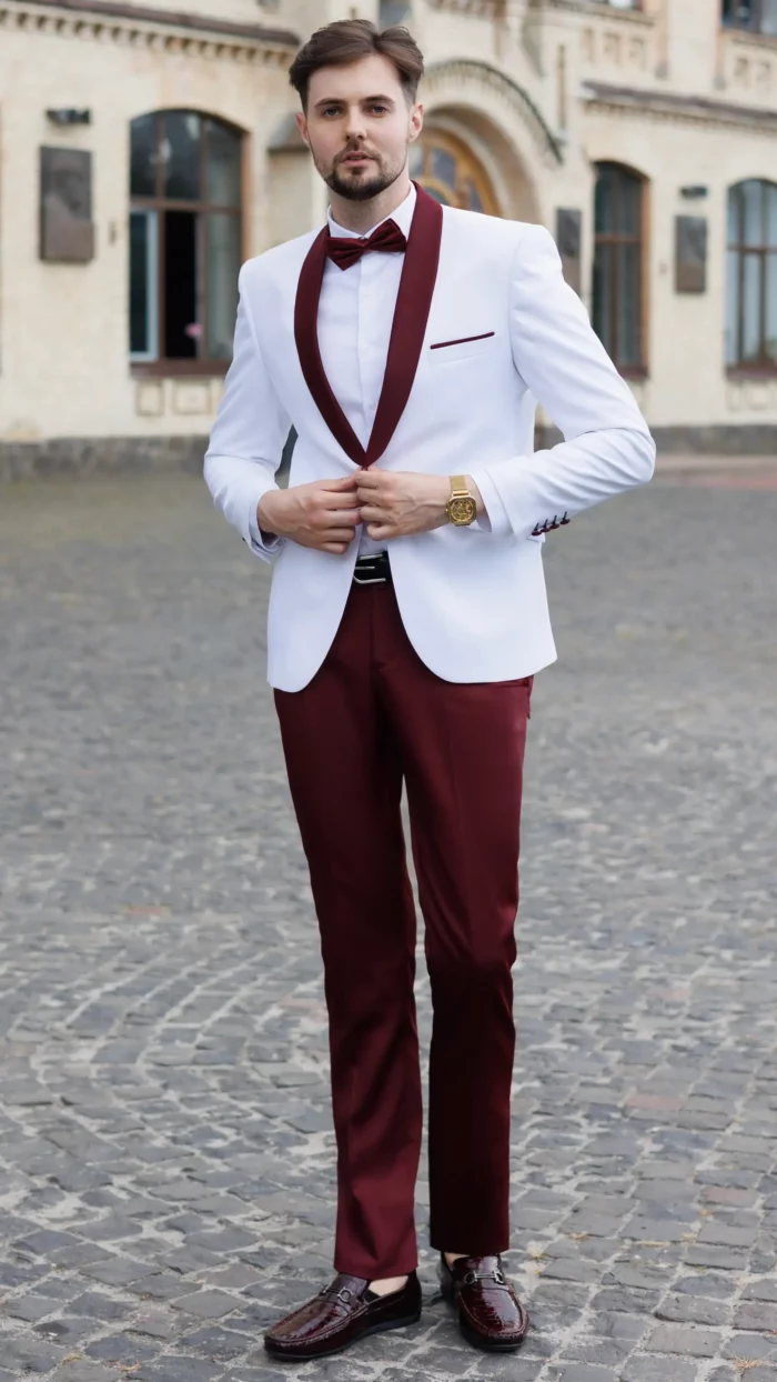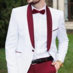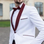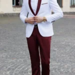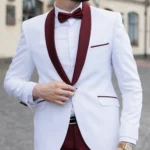 Елегантний чоловічий смокінг у сучасному виконанні. Поєднання білої піджака з бордовими лацканами та штанів створює стильний контраст, що підкреслює індивідуальність. Модель доступна в різних кольорах – як класичних однотонних, так і оригінальних поєднаннях. Ідеальний вибір для весіль, балів, корпоративних заходів та урочистих вечорів.