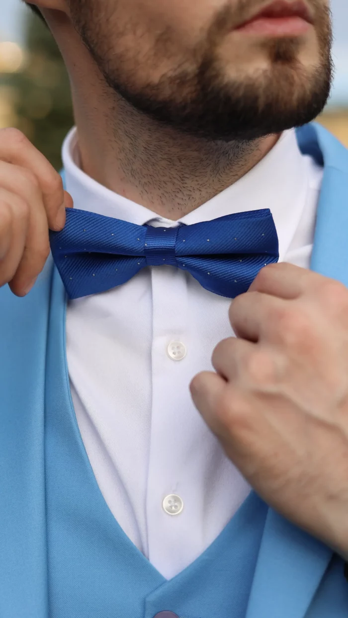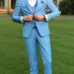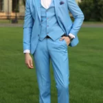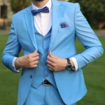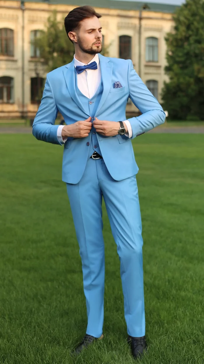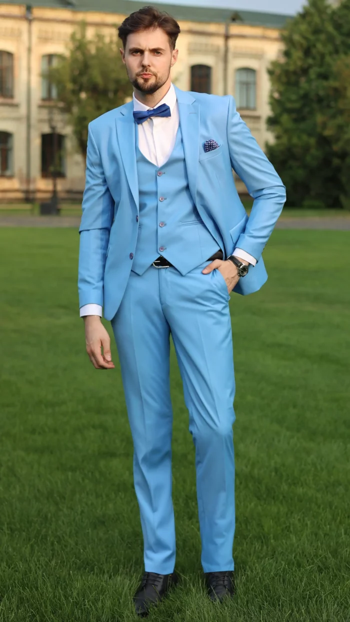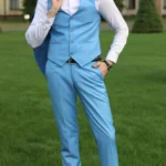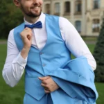 Елегантний чоловічий костюм у небесно-блакитному кольорі – вибір для сміливих та стильних. Трикотажна тканина з ідеальною посадкою підкреслює фігуру, а жилет та метелик додають образу вишуканості. Такий костюм стане яскравим акцентом на весіллі, випускному, вечірці чи фотосесії. Стильний та сучасний варіант як для купівлі, так і для оренди в Laura Style.