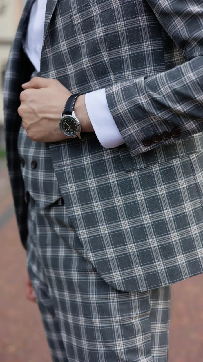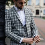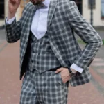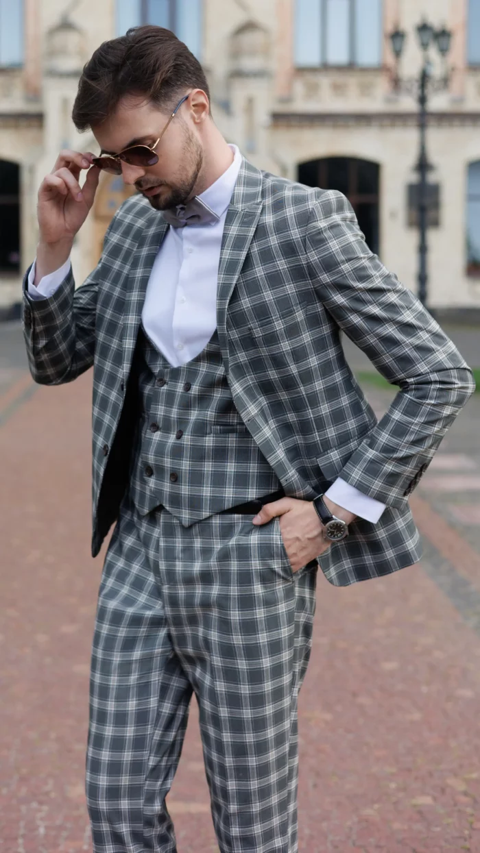 Стильний чоловічий костюм у клітинку, що складається з піджака, приталених штанів та подвійного жилета. Сірий відтінок із білою клітинкою створює сучасний та елегантний образ. Костюм ідеально підходить для весілля, випускного, корпоративу чи світського заходу. Доповнений класичною білою сорочкою та метеликом, цей комплект підкреслить індивідуальність і бездоганний смак чоловіка.