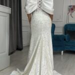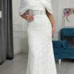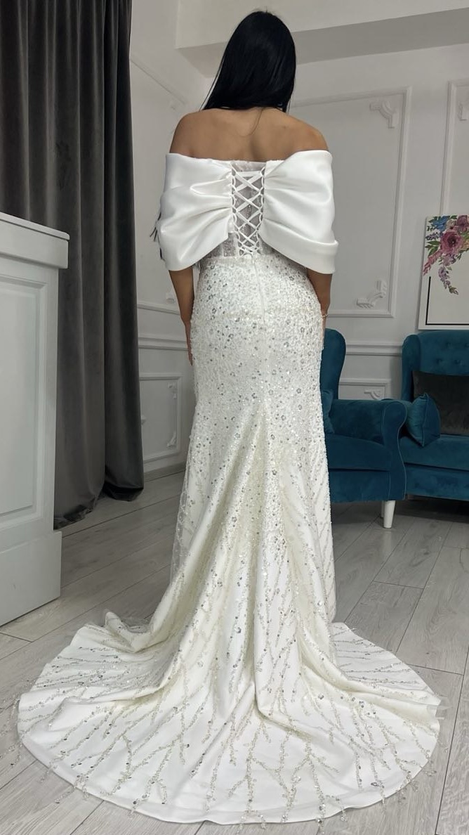 Розкішна весільна сукня фасону «рибка» з відкритими плечима — вибір для нареченої, яка хоче виглядати дорого, сучасно й бездоганно. Верх із м’якої драпіровки ніжно огортає плечі, створюючи елегантну лінію декольте. Прозорий корсет розшитий вручну великою паєткою та бісером, що красиво мерехтить у світлі, немов діаманти. Сукня щільно облягає фігуру, підкреслюючи талію, і плавно переходить у вишуканий шлейф. Образ модної та впевненої нареченої, що поєднує блиск, стиль і романтику.