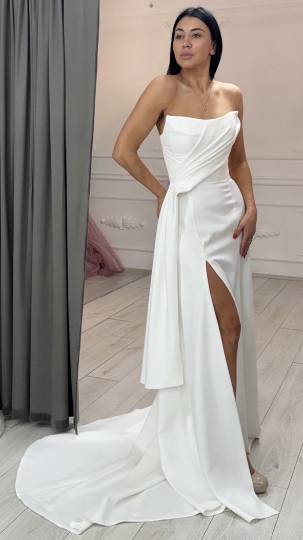 Елегантна весільна сукня з щільного сатину без бретелей. Асиметричні драпіровки красиво підкреслюють талію та додають образу витонченості. Глибокий розріз на нозі додає звабливості, а довгий шлейф створює ефект королівського ходу. Ідеальний вибір для сучасної нареченої, яка цінує лаконічність, розкіш і стиль.