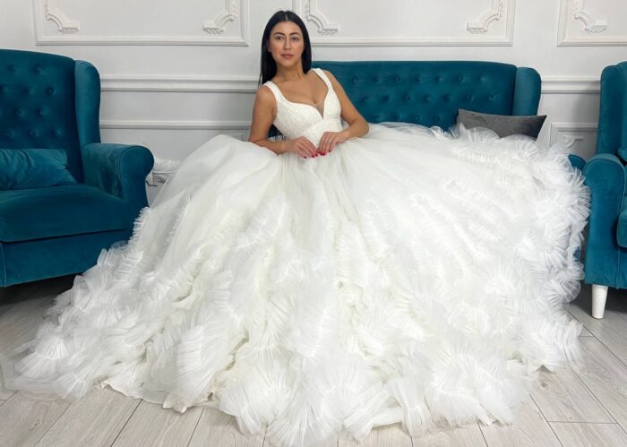 Розкішна весільна сукня з глибоким V-вирізом і прозорою вставкою, що витончено підкреслює декольте. Корсет щільно розшитий дрібним хрусталем, який мерехтить при кожному русі, створюючи ефект дорогоцінного сяйва. Пишна фатинова спідниця прикрашена нижнім шаром з об’ємними воланами, що додають легкості й величного об’єму. Сучасна та елегантна модель для нареченої, яка хоче виглядати неперевершено.