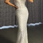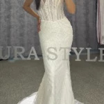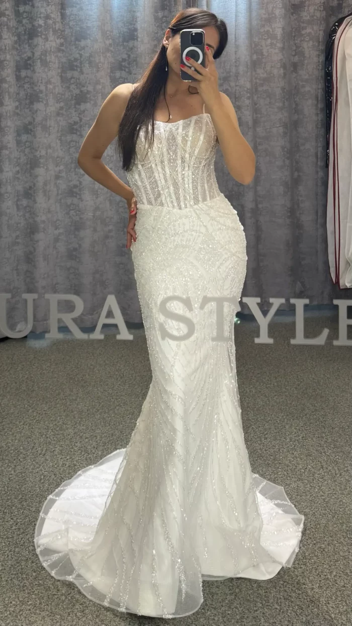 Розкішна весільна сукня силуету «рибка», створена для сучасної та стильної нареченої. Модель виконана з делікатного мерехтливого полотна, повністю розшита вручну бісером і паєтками. Напівпрозорий корсет красиво підкреслює талію, а тонкі бретельки додають ніжності образу. Легкий шлейф елегантно тягнеться позаду, створюючи відчуття гармонії та витонченості. Ідеальний вибір для дорогої, впевненої у собі нареченої, яка цінує бездоганний стиль і вишукану простоту.