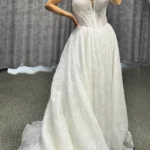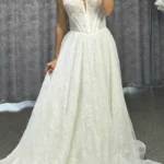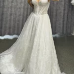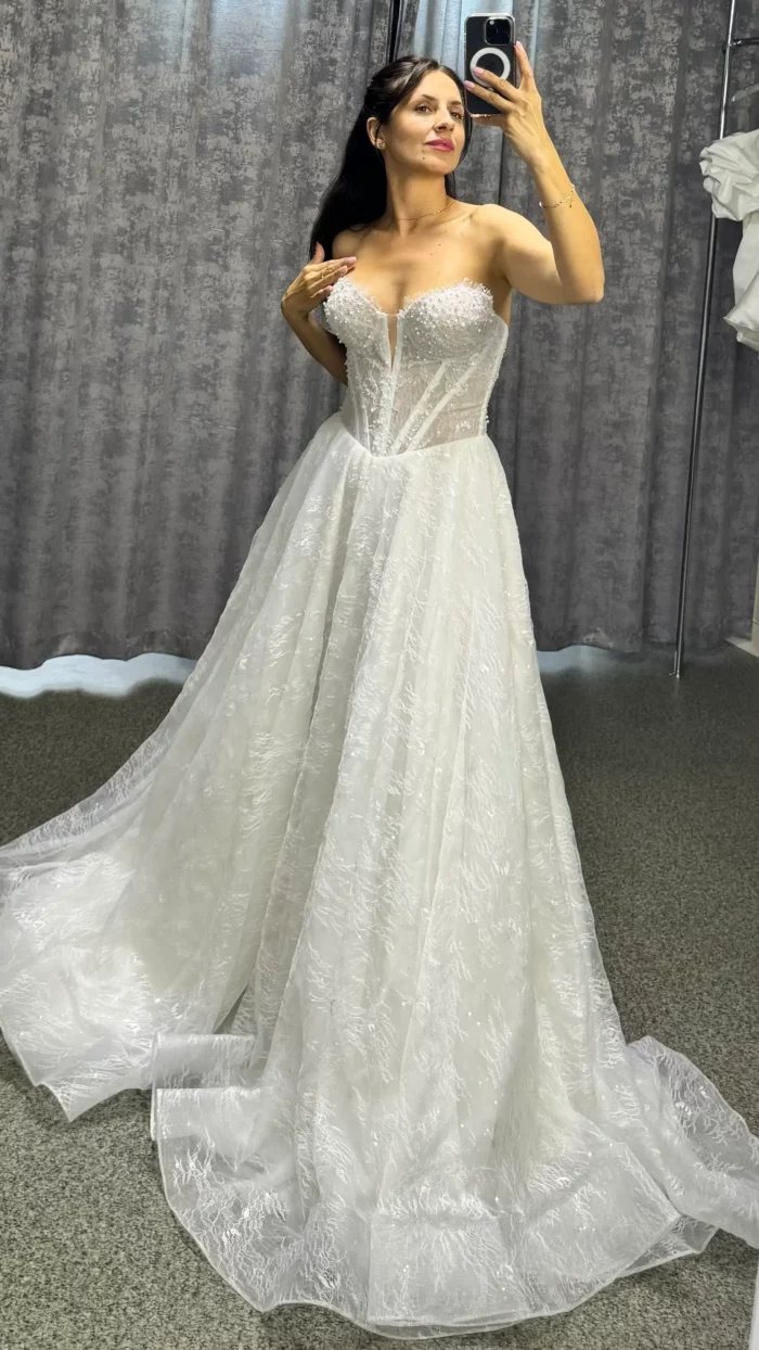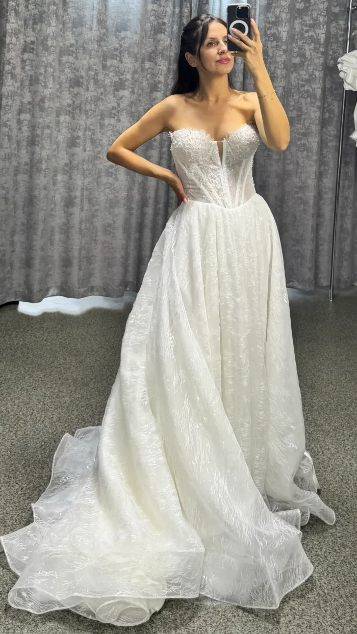 Розкішна весільна сукня з розшитого шантильє у відтінку айворі. Пишна спідниця зі шлейфом створює ефект казкової легкості. Корсет красиво розшитий бісером і паєтками, з формованими чашечками, що ідеально підкреслюють фігуру. Образ виглядає ніжно, але дорого та елегантно.