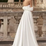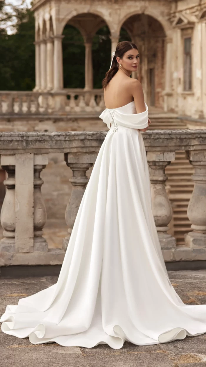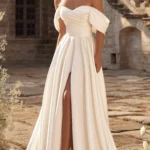 Елегантна весільна сукня з відкритими плечима та драпірованим корсетом, який підкреслює лінію талії. Розкішна спідниця зі шлейфом м’яко струмує при ході, а розріз додає образу спокуси та легкості. Сукня створена з щільного атласу кольору айворі, поєднує класику і сучасність, ідеально підходить для витонченої нареченої.