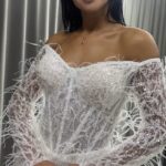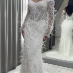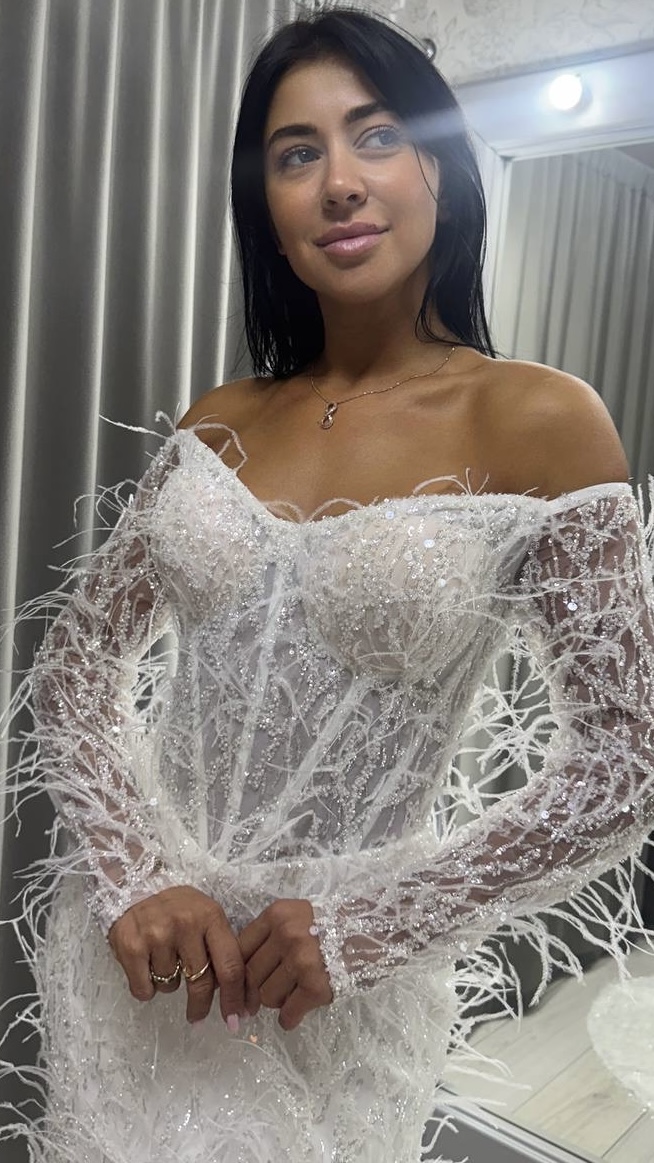 Неймовірно елегантна весільна сукня фасону «рибка» з натуральним страусовим пір’ям. Корсет із відкритими плечима та довгими прозорими рукавами, повністю розшитий вручну блискітками та бісером. Вишуканий блиск і фактура створюють образ дорогої, модної та романтичної нареченої.