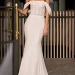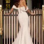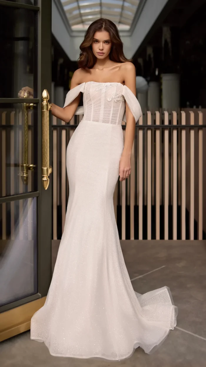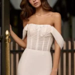 Сукня Artizia — розкішна весільна сукня силуету «рибка», створена для сучасної нареченої. Гладка блискуча тканина елегантно облягає фігуру, підкреслюючи лінії тіла. Корсет із прозорими вставками та витонченою вишивкою створює ефект легкості та візуально стрункішої талії. Особливість сукні — елегантні спущені рукави, що додають ніжності та витонченості образу.