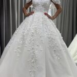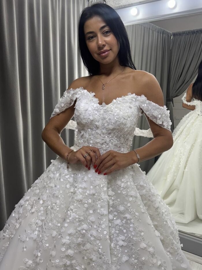 Розкішна весільна сукня принцесового силуету з відкритими плечима та жорстким корсетом. Вся поверхня оздоблена об’ємними 3D-квітами, бісером і паєтками, що створюють неймовірно сяючий ефект. Юбка щільна, з делікатним блиском, чудово тримає форму. Ідеальний вибір для нареченої, яка мріє про казковий, елегантний образ.