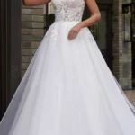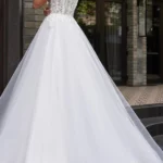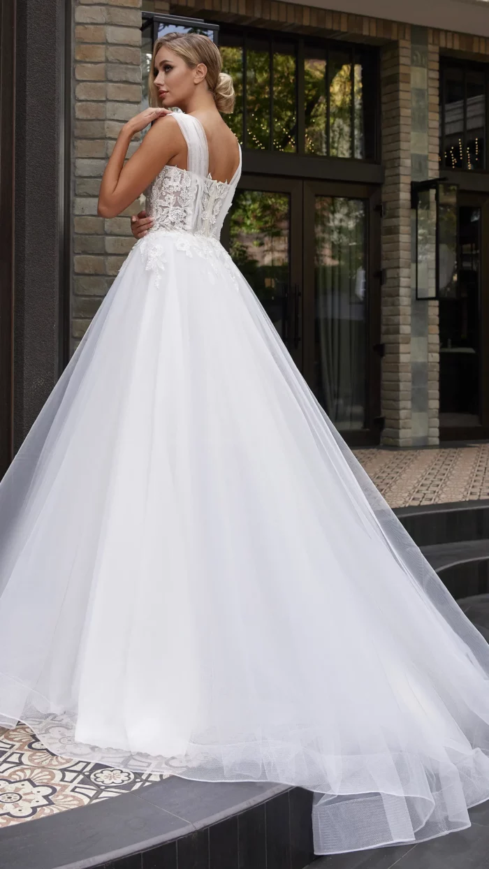 Сукня має розкішну фатинову спідницю, що створює легкий об’єм та казковий шлейф. Верх виконаний з витонченого мережива з 3D-аплікаціями, які м’яко підкреслюють фігуру. Прозорий корсет додає образу вишуканої сексуальності, не виходячи за межі класичної стриманості.